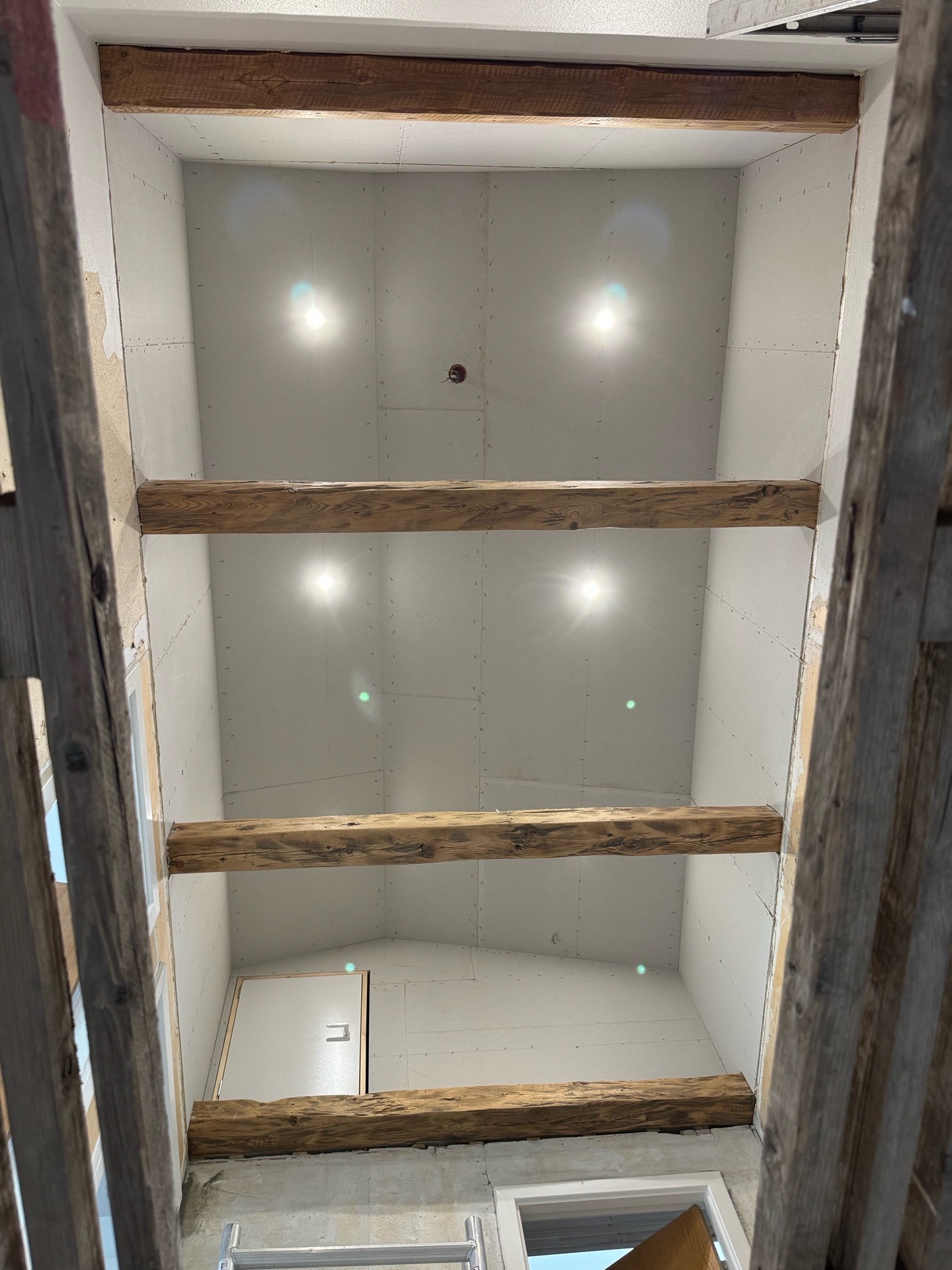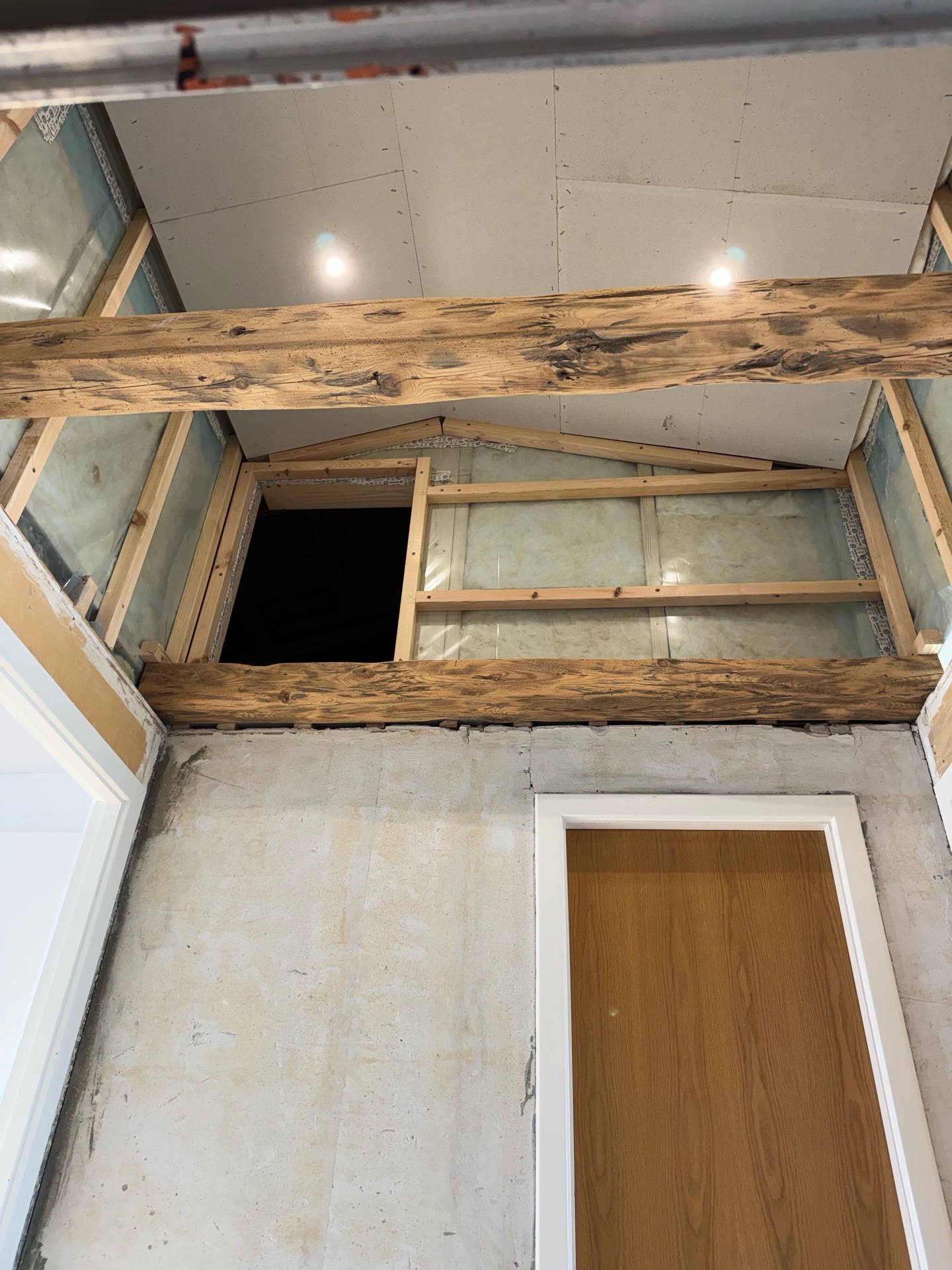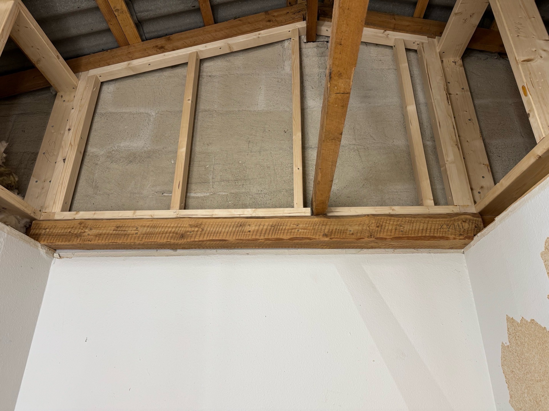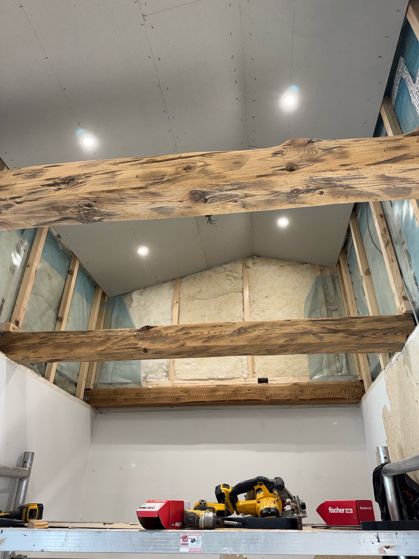 Her har vi lavet lidt om i tagkonstruktionen så der er åbnet op til kip. derefter har vi indlagt ældre hanebånd fra en ældre lade bygget i 1888.